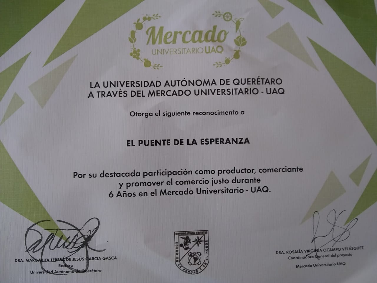 Recognition by the Outstanding participation as a producer, trader and promoter of fair trade for 6 years. by the Universidad Autónoma de Querétaro through the University Market.