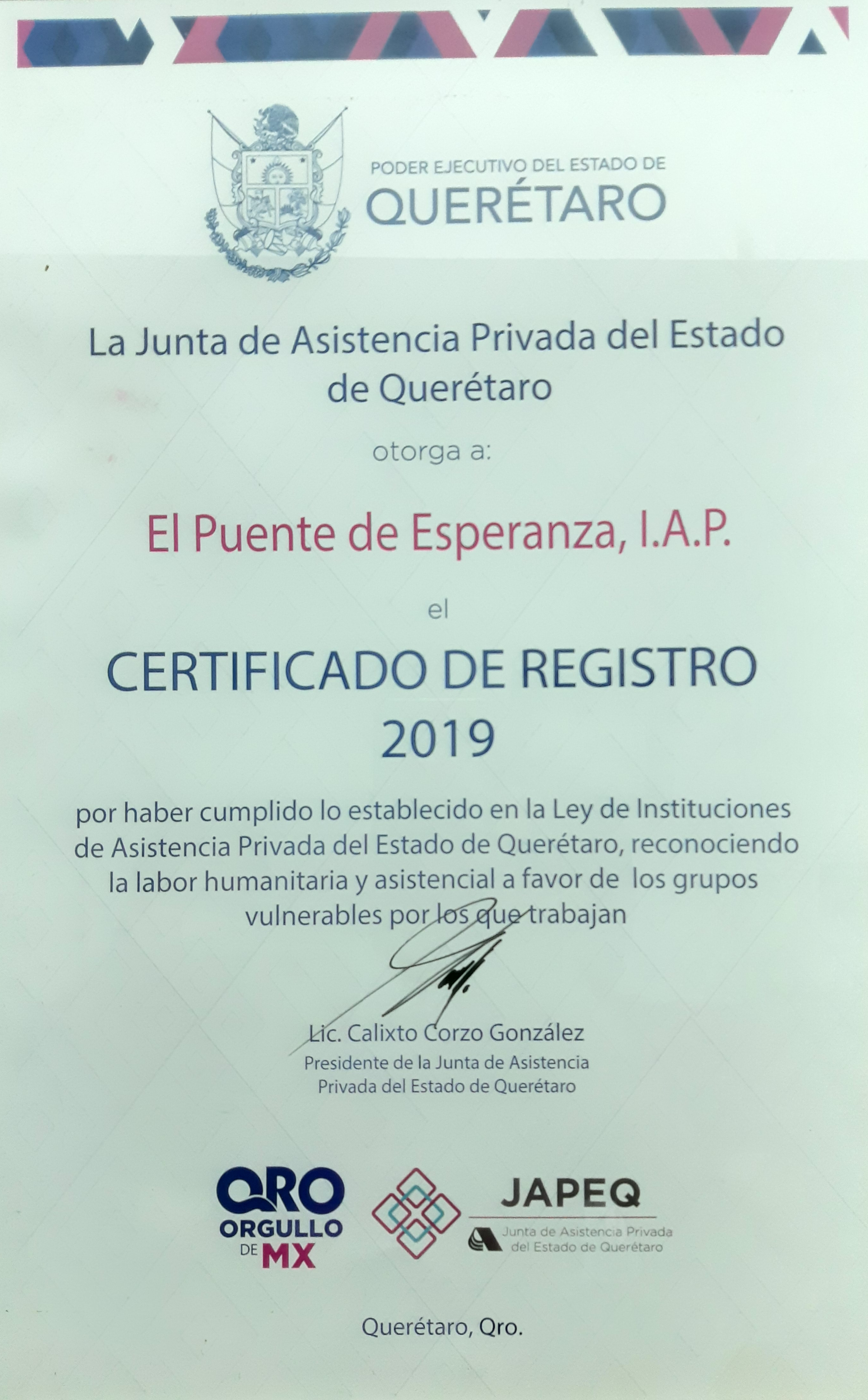 The Certificado de Registro 2019 by the Junta de Asistencia Privada del Estado de México.