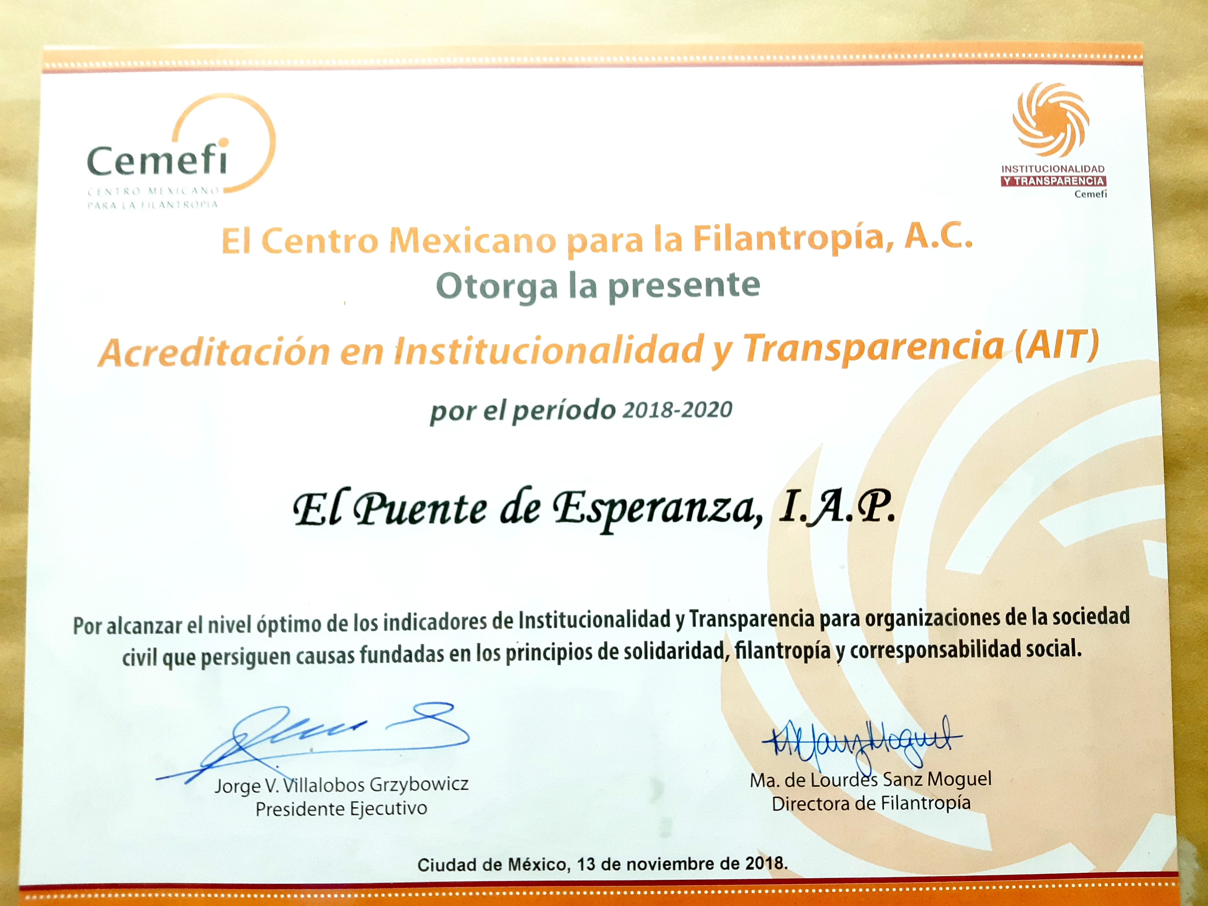 Renewal: Accreditation of Institutionalism and Transparency by El Centro Mexicano para la Filantropía, AC. Optimum Level.
