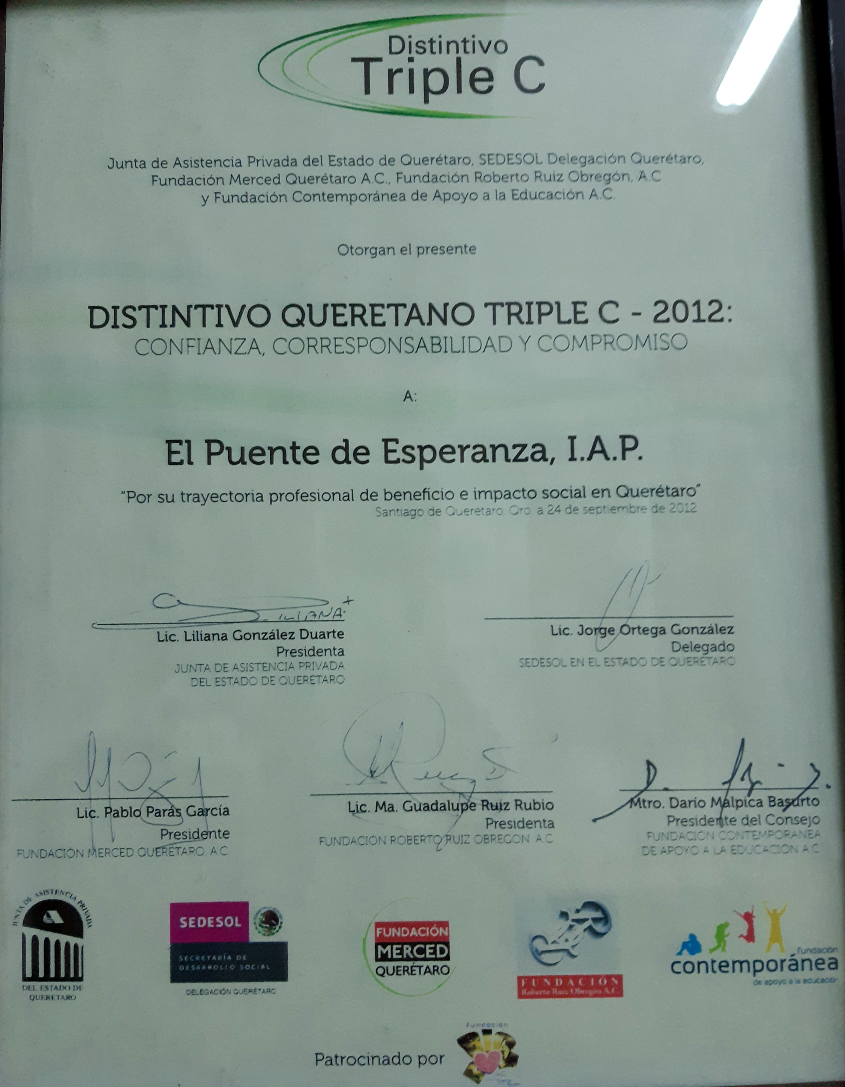The Distintivo Queretano Triple-C 2012: Confianza, Correspondencia y Compromiso by foundations and governmental agencies in the State of Querétaro.