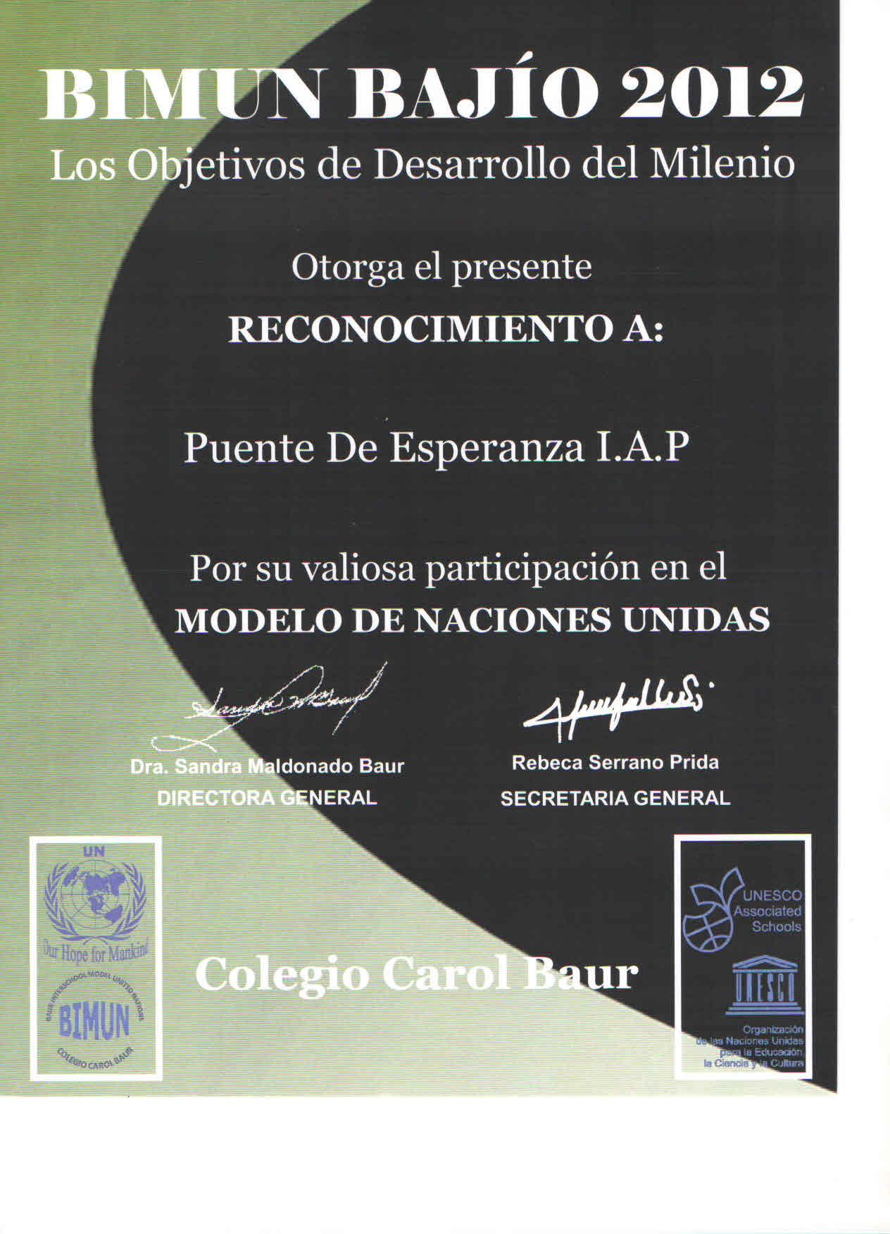Recognition for their valuable participation in Model United Nations "BIMUN Bajío 2012" by Colegio Carol Baur.