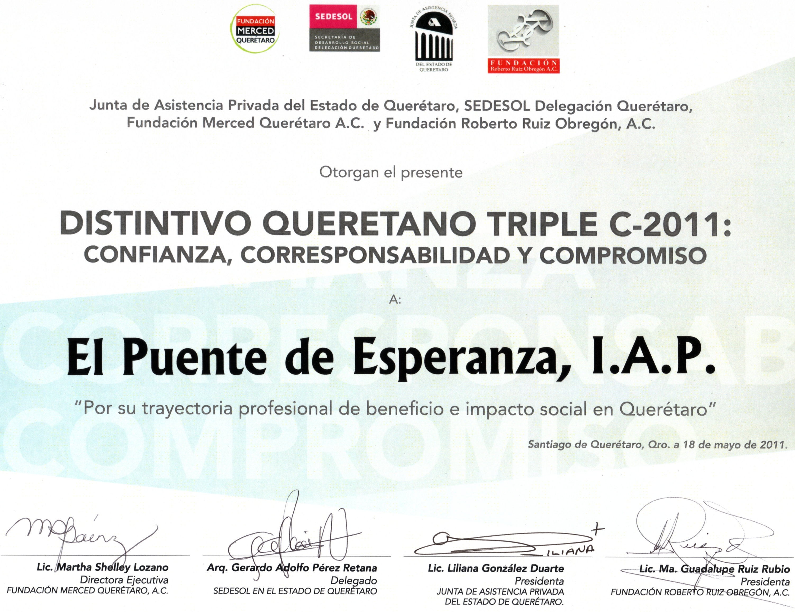 The Distintivo Queretano Triple-C 2011: Confianza, Correspondencia y Compromiso by foundations and governmental agencies in the State of Querétaro.