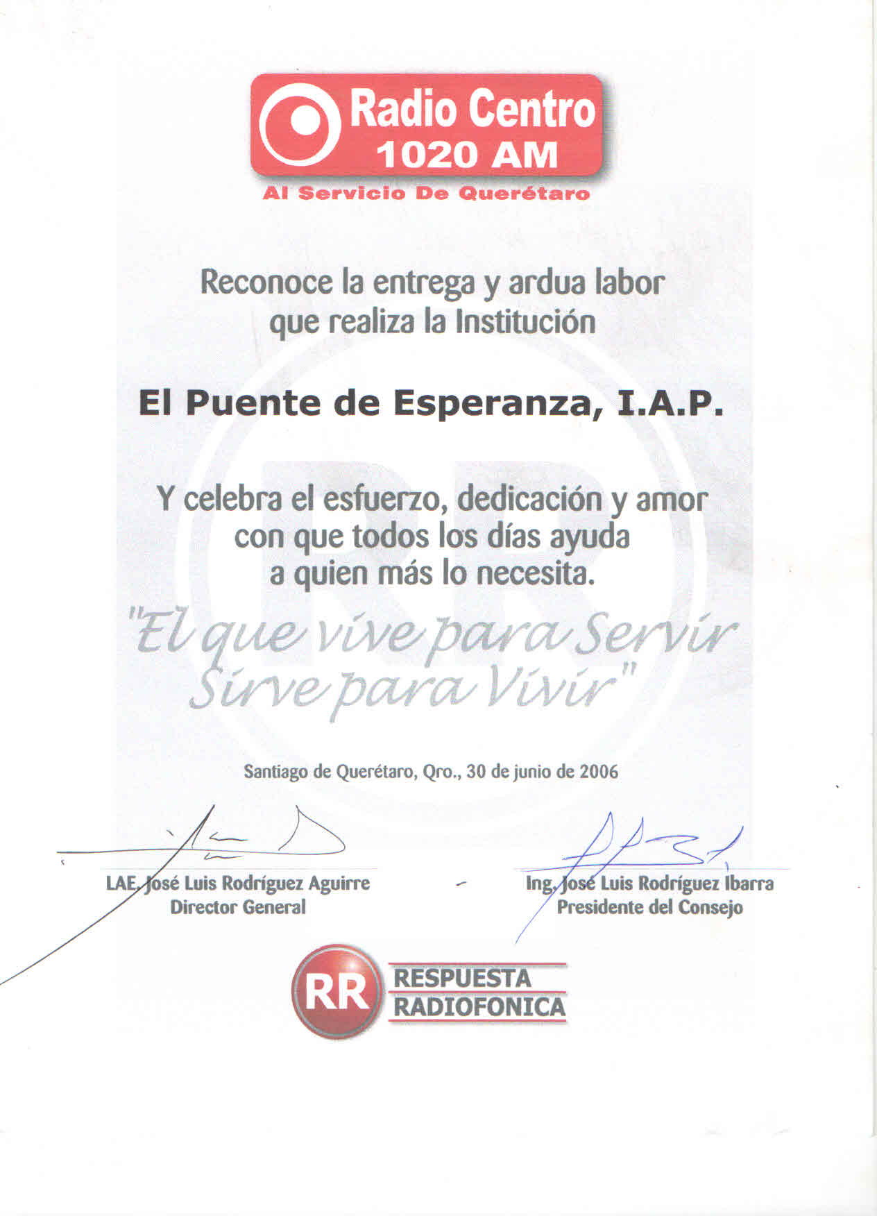 Recognition for the dedication and hard work of the institution "El que vive para servir, sirve para vivir" by Radio Centro 1020 FM.