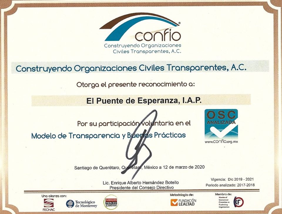 Construyendo Organizaciones Civiles transparentes , A.C. awards recognition to EL Puente de Esperanza, for accrediting the Model of Transparency and Good Practices.